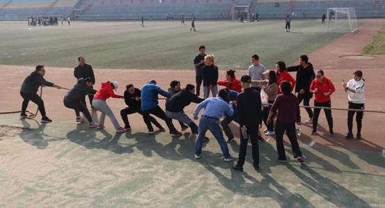 “一二,加油!一二,加油!”铿锵有力的口号声在田径场上响起,拔河比赛开始了。每位参赛老师都竭尽全力,为赢得比赛胜利而努力。比赛如火如荼地进行,口号声不断响起,每支参赛队伍都不甘示弱,力争上游。最后,行政队在全体队员的努力下拔得头筹,夺得了拔河比赛的第一名!
