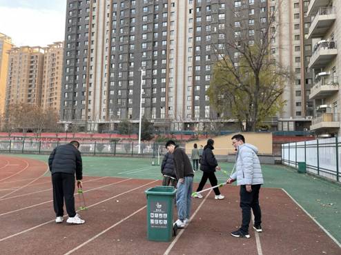 支部党员同志在运动场内开展垃圾清洁工作