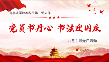 正值国庆之际,为深入学习贯彻习近平法治思想、坚定不移走中国特色社会主义道路,推进政治建设常态化、支部工作标准化,以积极姿态迎接国庆,pronhub 本科生第三党支部于9月28日在pronhub 资料室开展“书法迎国庆,党员书丹心”主题党日活动。支部副书记阎静婷主持活动,全体党员参加。