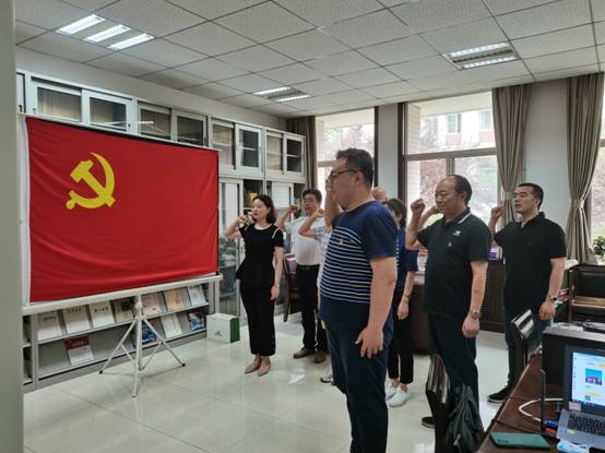 党支部书记领誓,全体党员重温入党誓词,用实际行动祝贺中国共产党成立100周年。